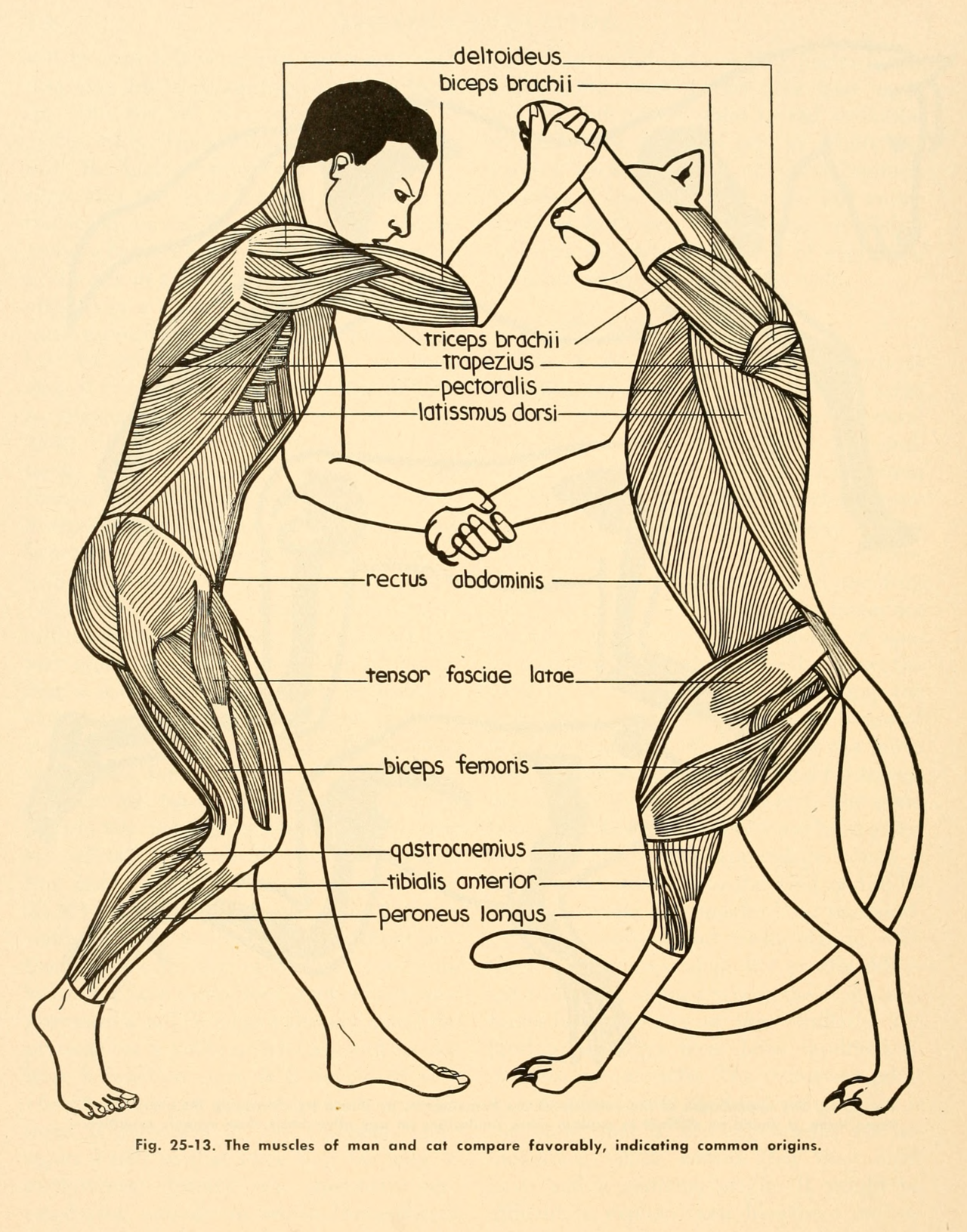“The muscles of man and cat compare favorably, indicating common origins.” . Zoology. 1952. -
