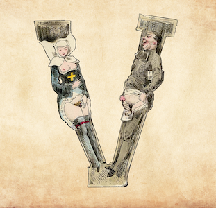Magnet featuring the letter V from the Erotic Alphabet, 1880, by French artist Joseph Apoux (1846-1910). -