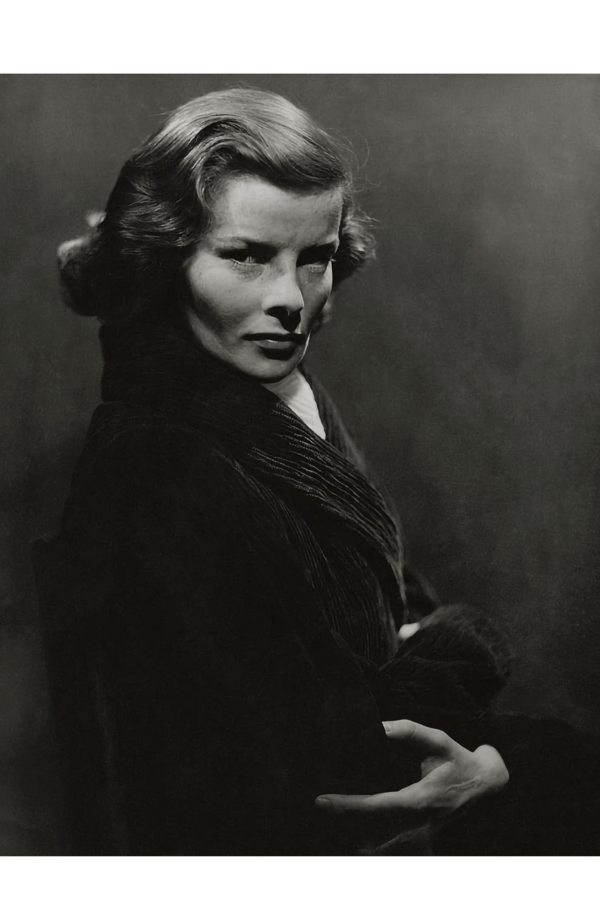 A portrait of Katharine Hepburn frowning with her arms crossed by Lusha Nelson, 1933 - Postcard -