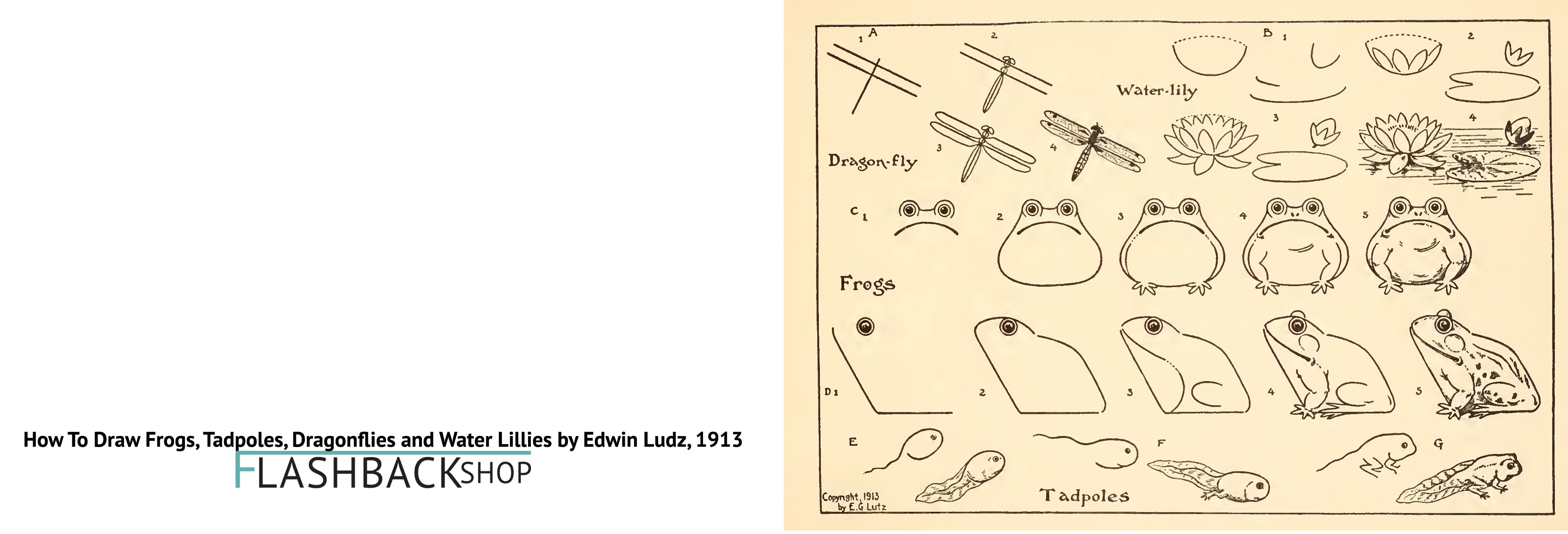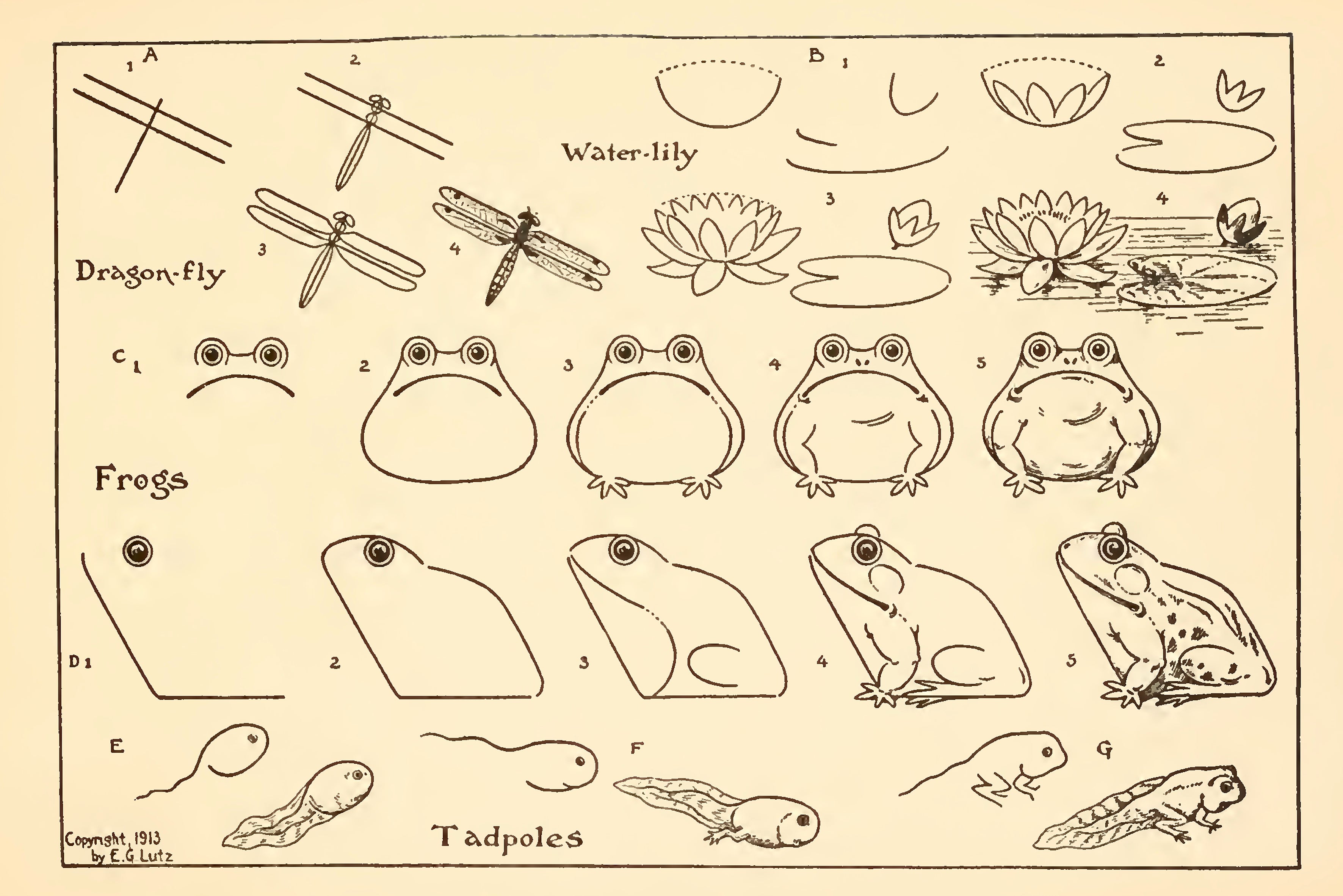 How To Draw Frogs, Dragonflies, Water Lilles and Tadpoles, 1913 - Postcard