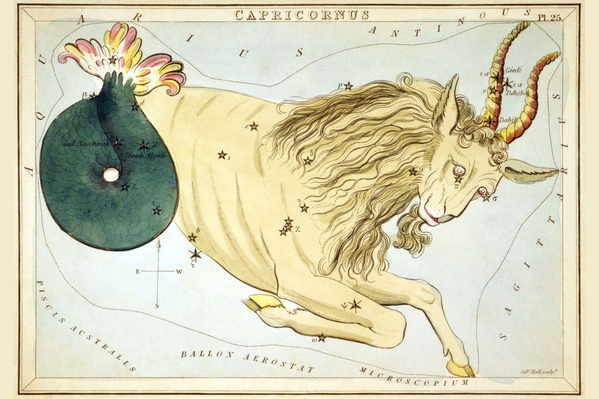 Sidney Hall: Urania's Mirror "Capricornus", lámina 25 en Urania's Mirror, un juego de cartas celestiales acompañado de Un tratado familiar sobre astronomía... de Jehoshaphat Aspin. Londres. Carta astronómica, 1 impresión sobre cartón estratificado: grabado, coloreado a mano. Biblioteca del Congreso - 1824.