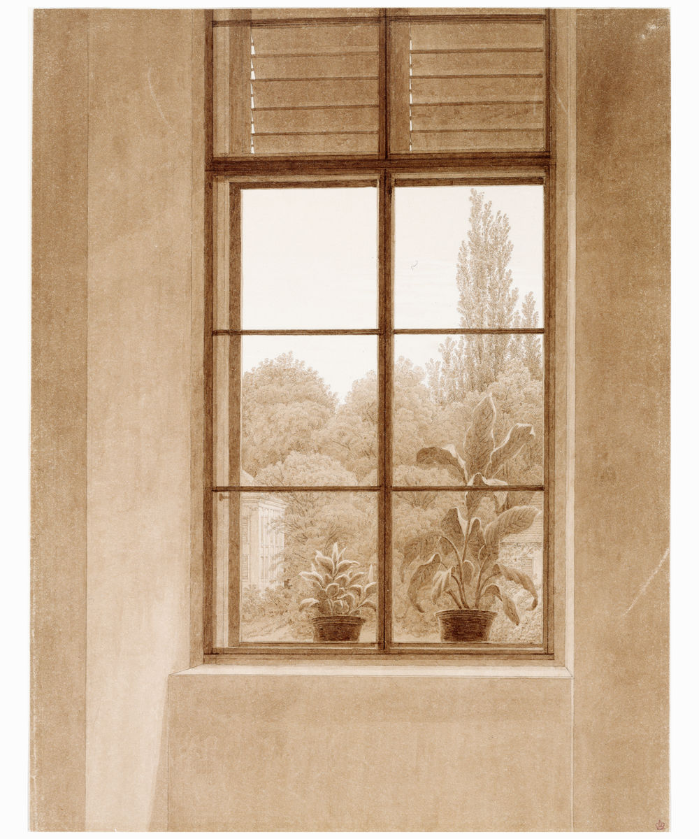 Caspar David Friedrich : Ventana que da al parque / Fenster mit Blick auf den Park (c.1810-11). Dibujo, tinta sepia sobre lápiz, 39,8 cm x 30,5 cm El Hermitage, San Petersburgo.