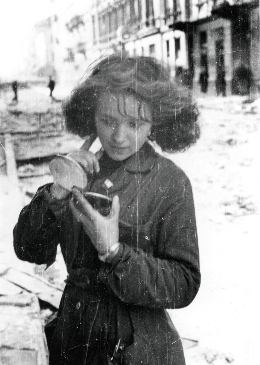 Girl with a mirror after air raid at Złota street near Zgoda street Warsaw mid-September 1944