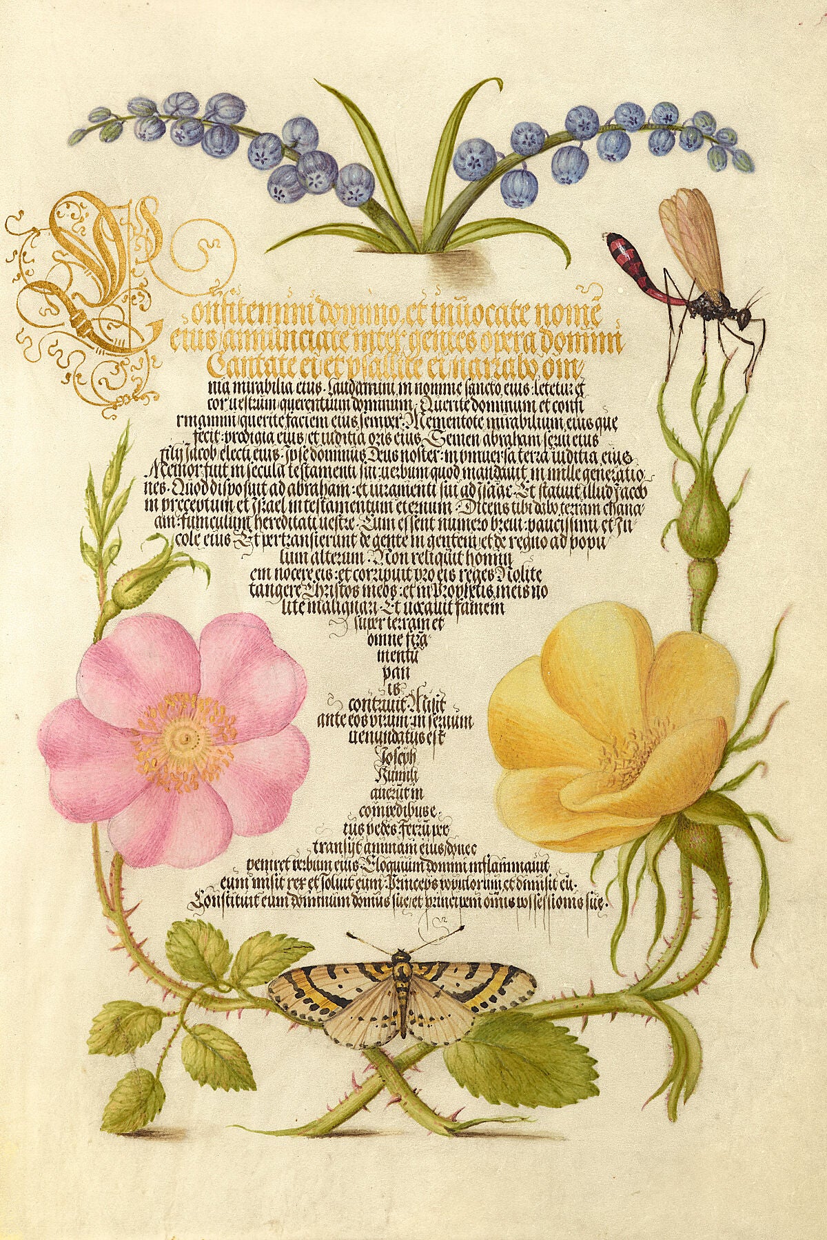 Grape Hyacinth, Wasplike Insect, Eglantine, Austrian Brier, and Magpie Moth 1561–1562; illumination added 1591–1596 by Joris Hoefnagel and Georg Bocskay