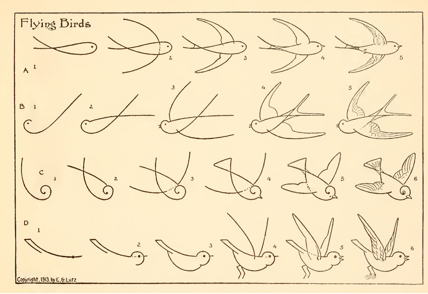 How To Draw Flying Birds by Edwin Lutz, 1913 - Postcard