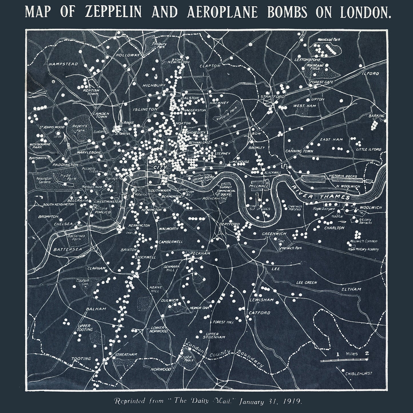 Map of Zeppelin and Aeroplane Bombs on London in WW1 by Herbert Green - 1919