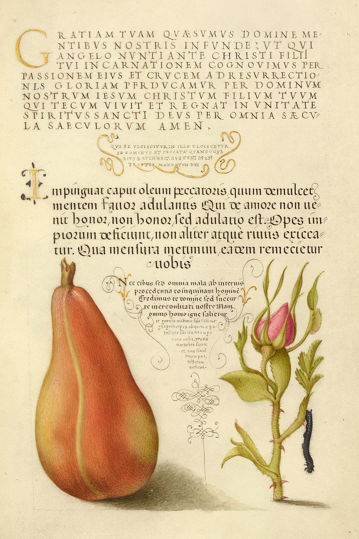 Pear, French Rose, and Caterpillar 1561–1562; illumination added 1591–1596 by Joris Hoefnageland Georg Bocskay