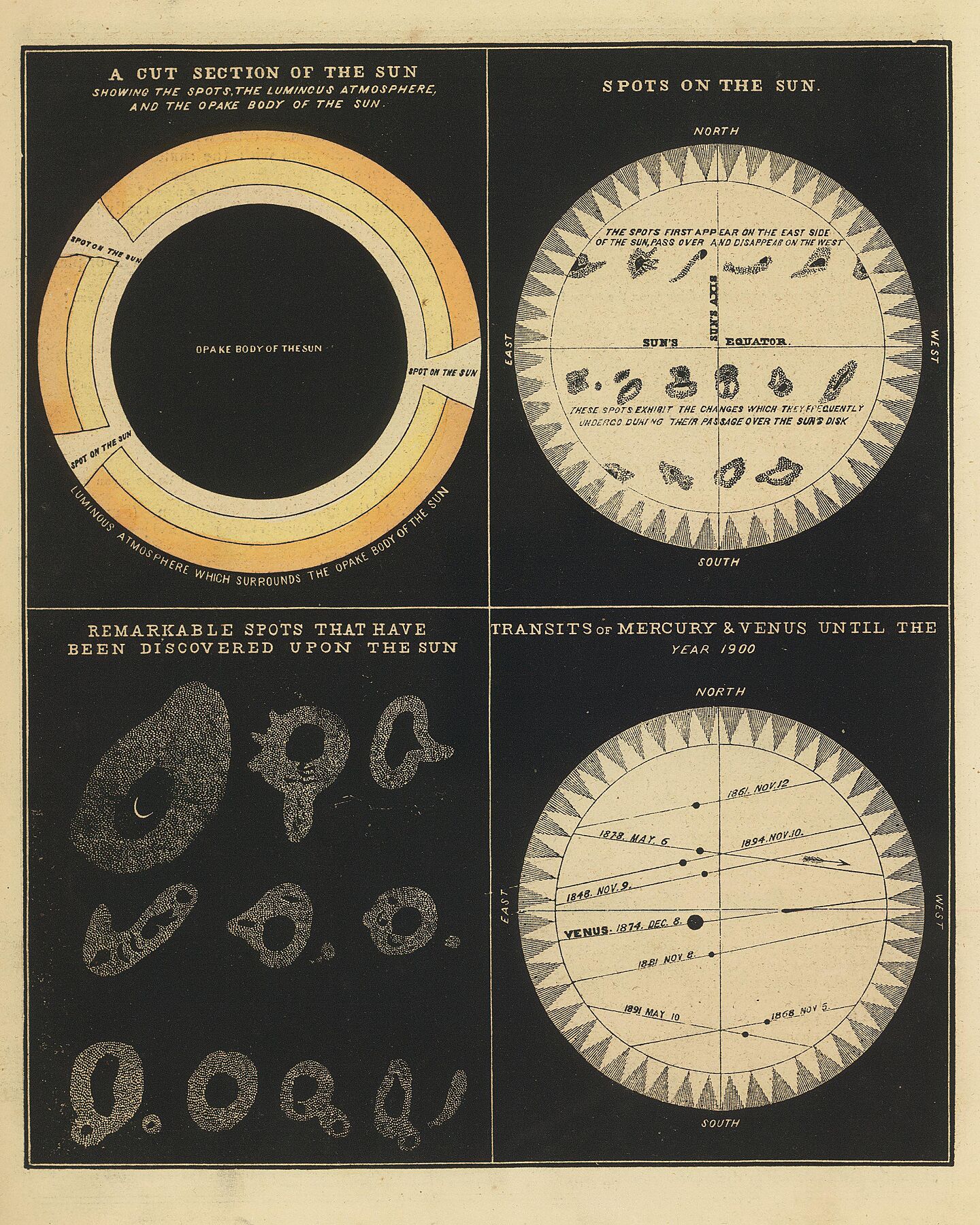 Sun, Spots on the Sun, Transits of Mercury & Venus from Smith's Illustrated Astronomy by Asa Smith - 1849/1850