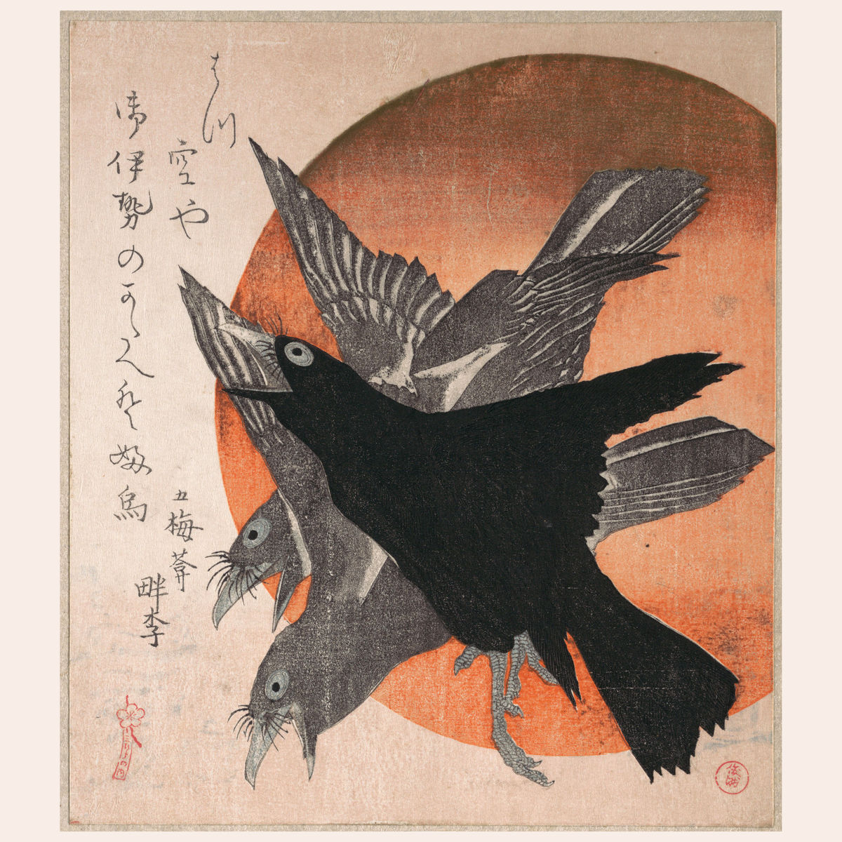Three Crows against the Rising Sun, from the series Three Sheets (Mihira no uchi),mid- 1810s by Totoya Hokkei Japanese, Edo period , Part of an album of woodblock prints (surimono); ink and colour on paper. 21 x 18.4 cm