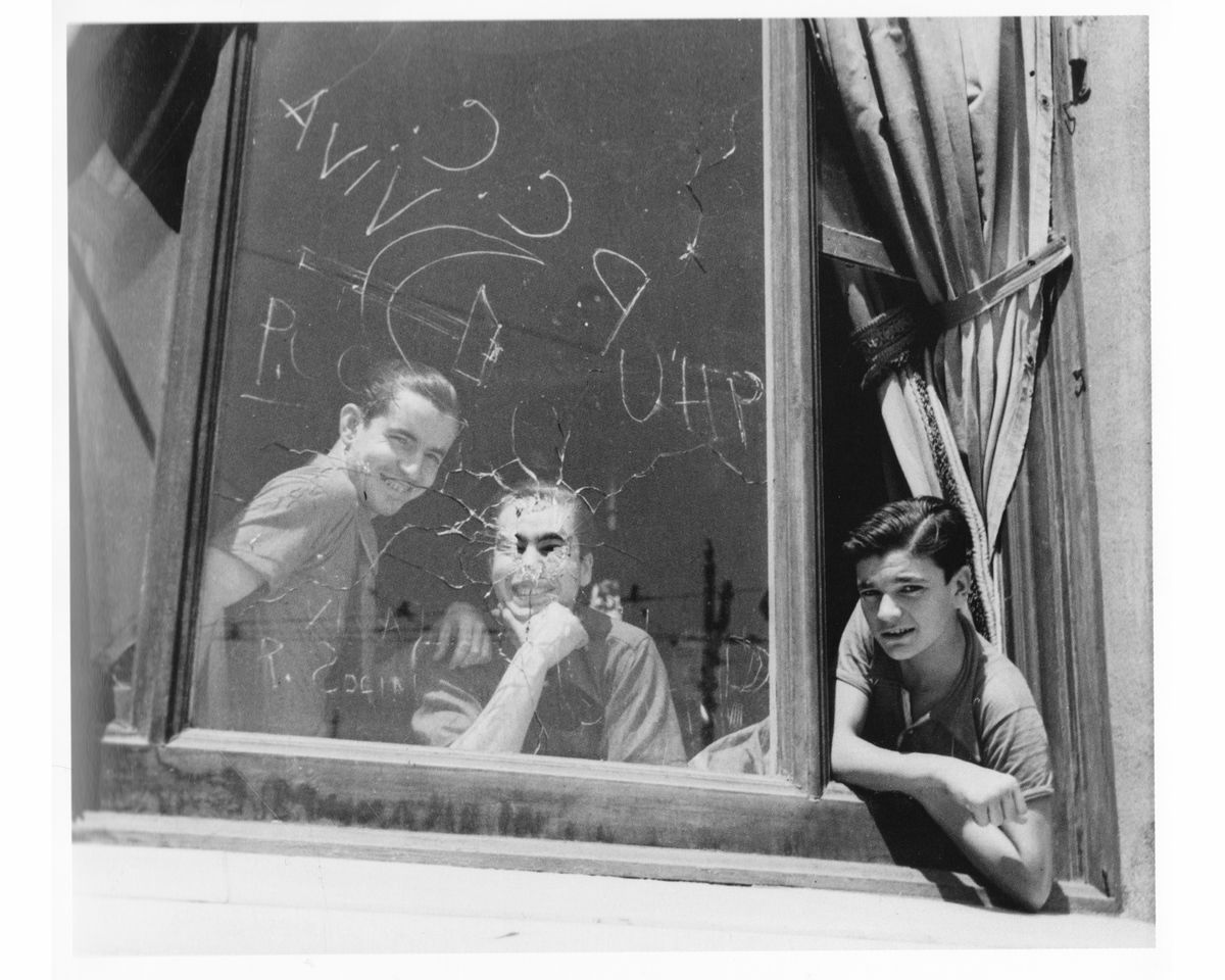 Three men at the Hotel Colon, Barcelona by Gerda Taro - August 1936