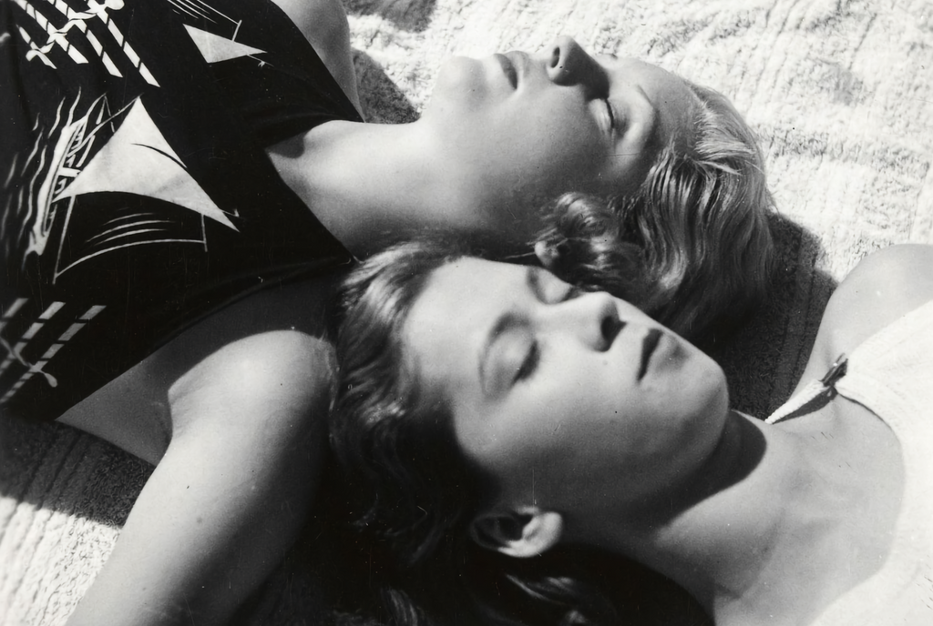 Two Women Wearing Swimming Costumes Lying Down With Eyes Closed by Curtis Moffat . c.1925-30 - Postcard