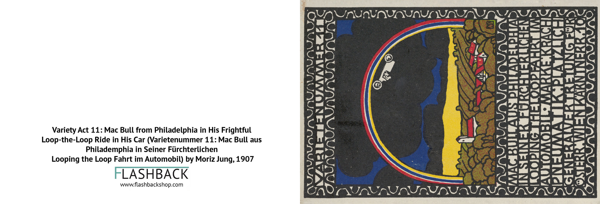 Variety Act 11 Mac Bull from Philadelphia in His Frightful Loop-the-Loop Ride in His Car (Varietenummer 11- Mac Bull aus Philademphia in Seiner Fürchterlichen Looping the Loop Fahrt im Automobil) by Moriz Jung, 1907 - Postcard
